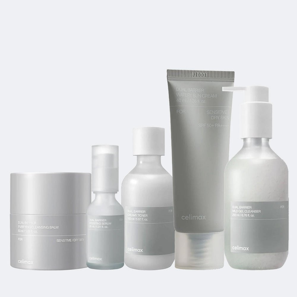 CELIMAX Dual Barrier Complete Care Set – Mild Gel Cleanser + Purifying Cleansing Balm + Creamy Toner + Boosting Serum + Watery Sun Cream