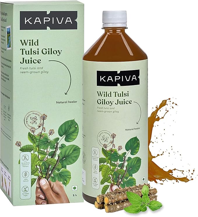 Kapiva Wild Tulsi Giloy Juice is a pure, natural health tonic made from freshly extracted Wild Tulsi (Holy Basil) and Giloy (Guduchi) stems. This immunity-boosting Ayurvedic blend helps the body fight infections, detoxifies the system, supports respiratory health, and promotes overall well-being. Regular consumption strengthens the immune response and maintains natural vitality.