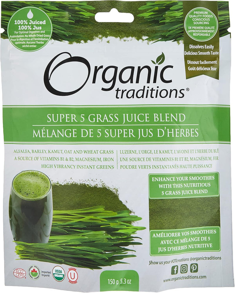 Organic Traditions Super 5 Grass Juice Blend is a nutrient-dense, alkalizing superfood powder crafted from five premium young grass juices — wheatgrass, barley grass, oat grass, alfalfa grass, and kamut grass. These grasses are harvested at their nutritional peak, then cold-pressed and low-temperature dried to preserve enzymes, chlorophyll, vitamins, and minerals. This potent green blend supports detoxification, digestion, and energy for everyday vitality.