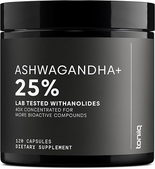 A: Toniiq’s 40:1 extract delivers 12,000mg equivalent strength per capsule and contains 25% withanolides — much higher than typical 2.5–5% extracts.
